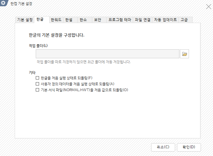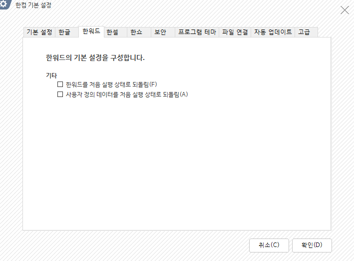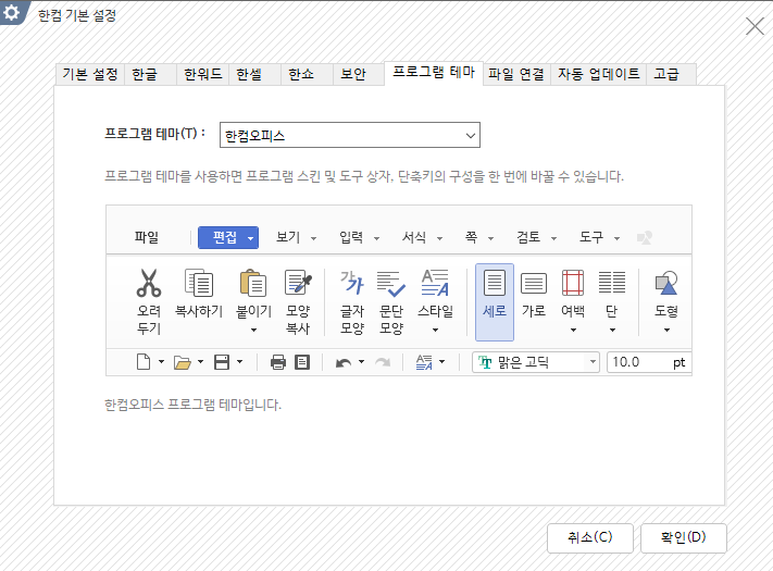 사용자 설정에서는 한글, 한워드, 한쇼, 한셀 프로그램들 설정뿐만 아니라 테마, 자동업데이트 등 본인이 원하는대로 설정을 하실 수 있습니다. 원하는 목록을 선택해보시고 원하는대로 설정을 맞추셨다면 하단에 '확인'버튼을 클릭해주시기 바랍니다.