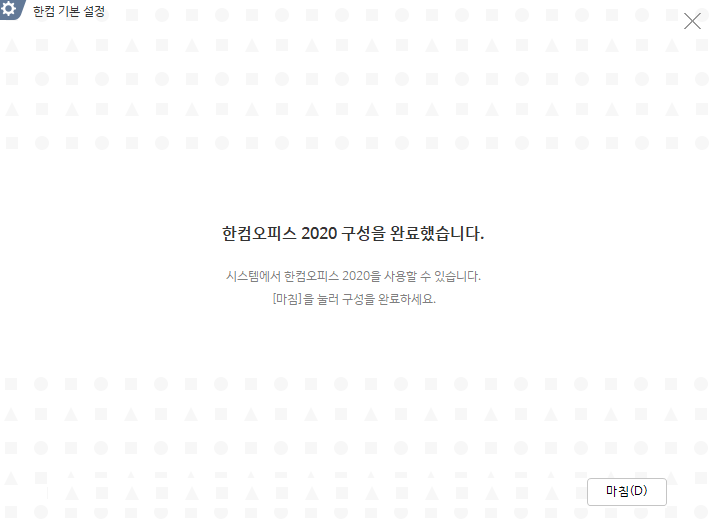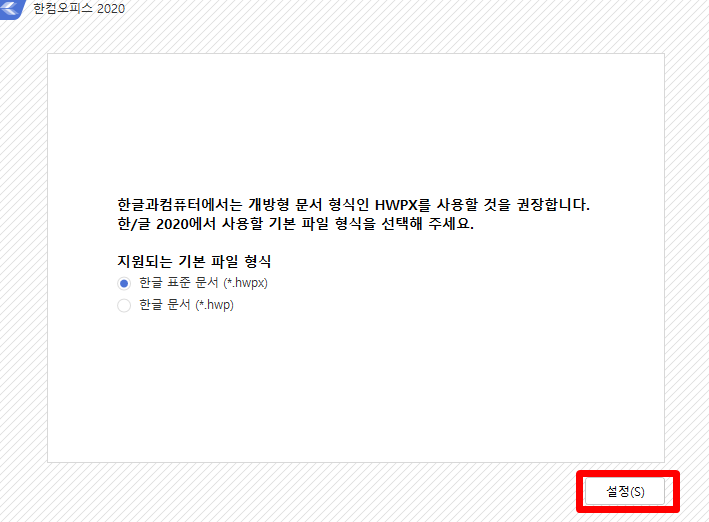 설치가 완료되면 설치 완료 화면이 보이실텐데요. 바로 '다음'을 클릭해주시기 바랍니다. 이제 한글2020에서 사용할 기본파일 형식을 지정해주셔야 합니다. 한글과 컴퓨터에서는 'HWPX' 사용을 권장하고 있으므로 선택된 상태로 '설정'을 클릭해주시기 바랍니다.